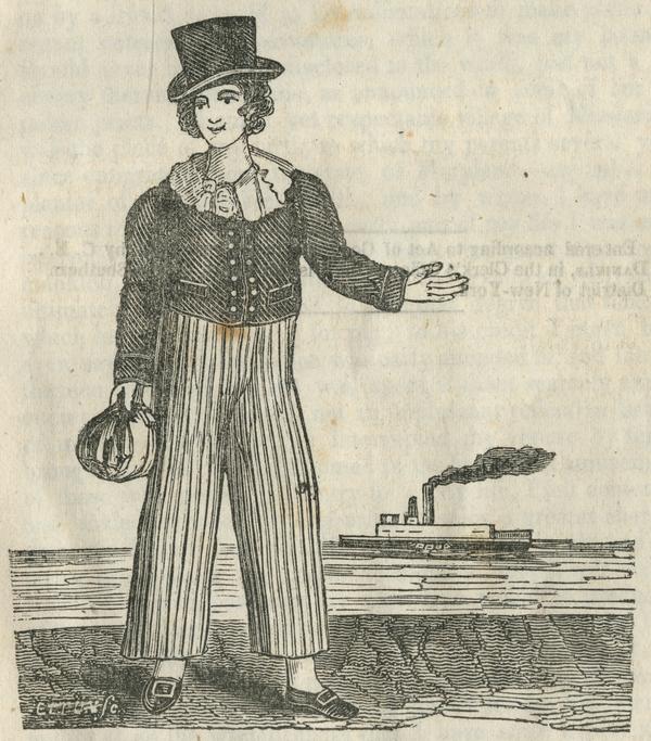 Full-length portrait of the woman, wearing a sailor suit and a top hat; a steamboat is visible on the horizon behind her. |