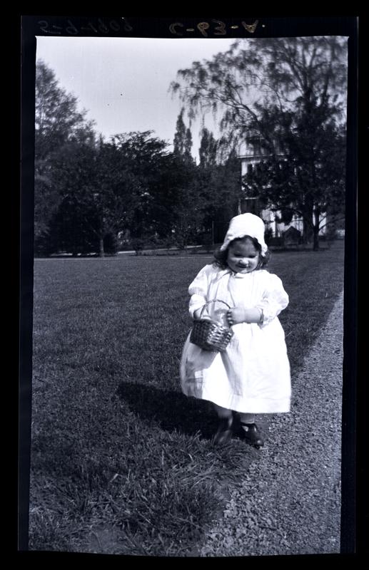Film engative showing Marriott C. Morris' daughter Janet Morris as a toddler standing in the grass near a garden path at their home at 131 W. Walnut Lane. She wears a long white frock, cap tied with a ribbon and holds a small basket in her hands.