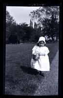 Film engative showing Marriott C. Morris' daughter Janet Morris as a toddler standing in the grass near a garden path at their home at 131 W. Walnut Lane. She wears a long white frock, cap tied with a ribbon and holds a small basket in her hands.