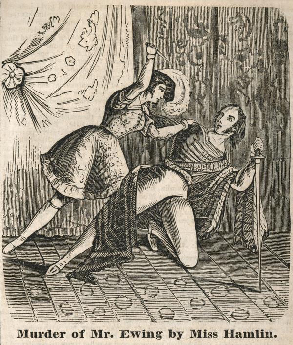 According to the accompanying article, Miss Hamlin (aka Miss Goodrich) killed Mr. Ewing in a theater in Mobile, Alabama, on March 25, 1842. “She eluded all pursuit and was not heard of till some months afterward when she was seen in male attire in one of the West India islands.”