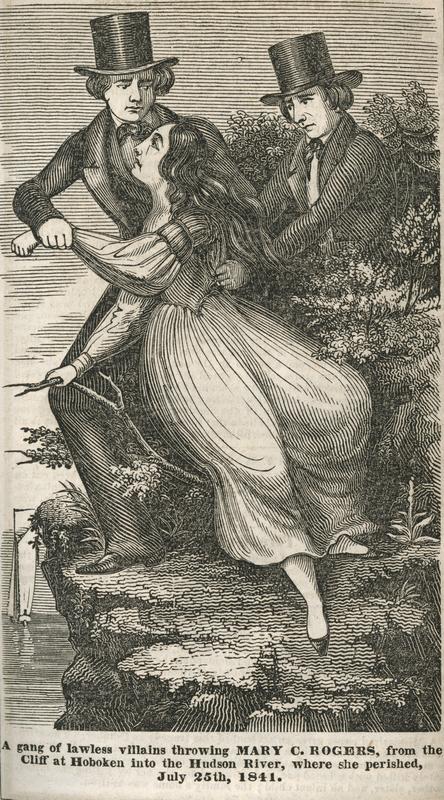 According to the accompanying article, Mary C. Rogers left her job in a cigar store on Broadway in New York City after customers started a rumor that she had been seduced. “The Beautiful Segar Girl” returned home to live with her mother. One Sunday, she set out to visit her cousins, but did not arrive. The following Wednesday her body was found floating in the North River, with “a rope tied around her neck in a way which ... created the suspicion that the persons who committed the act must have been seamen.”