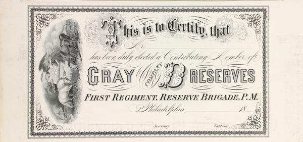 Membership certificate containing an allegorical vignette depicting the seal of Pennsylvania as a scenic view. View includes horses, the American eagle, and cityscape and a steam boat in the background. Certificate also contains corner details and a decorative border. The Gray Company was established in 1861 and active into the 20th century.
