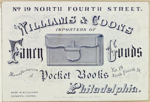 William & Coons, importers of fancy goods. Manufacturers of pocket books, no. 19 North Fourth St. Philadelphia. [graphic]