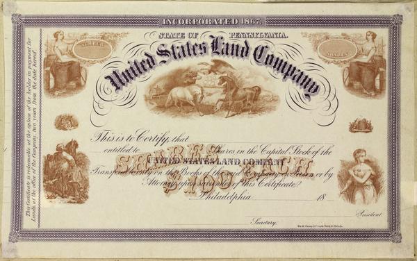 Stock certificate for the Philadelphia branch of the land company "Incorporated 1867" containing allegorical vignettes. Vignettes depict the seal of Pennsylvania as a scenic view; a female figure seated on crates in front of the mast of a ship; a farmer reaping his harvest; and a female figure in a wheat field. Also contains a geometric border and pictorial details showing the anchor of "Hope," and a bee hive.
