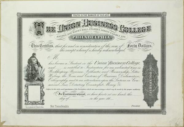 Receipt certificate for the Philadelphia business school, later renamed Peirce Business College, containing a vignette depicting the allegorical figure of Columbia. She holds a fasces and laurel wreath. Also contains a blank space (for a stamp) framed with an ornate border and a pictorial detail designed as a medal engraving.