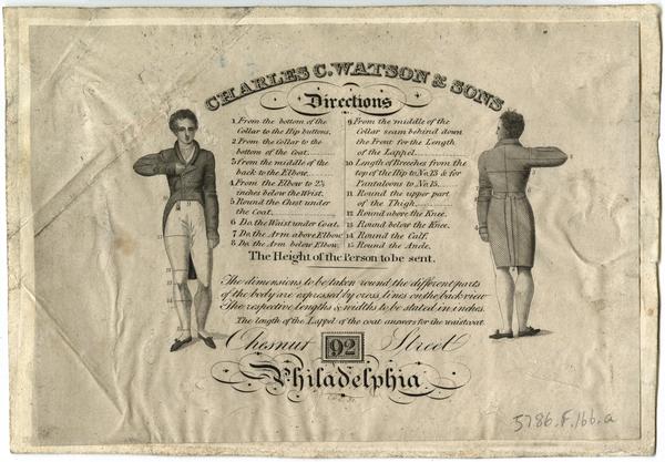 Advertisement for the tailor containing the numbered front and back of a male figure corresponding to a key of directions on taking measurements. Also includes text requesting "the height of the person to be sent" and the"length & widths to be stated in inches."