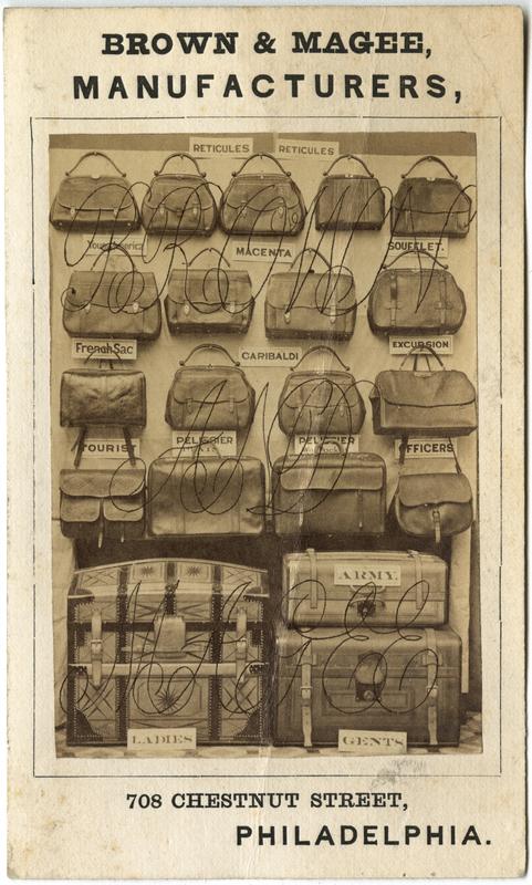 Photographic advertising card promoting Brown & Magee, trunk manufacturers, as successors to James E. Brown. Brown & Magee succeeded Brown circa 1866. Depicts a labeled display of men's and women's bags, valises, and trunks. Includes a soufflet bag; a French sac; an officers bag; a tourist bag; and an Army trunk.