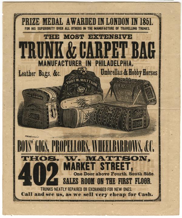 Thos. W. Mattson, 402 Market Street, one door above Fourth Street, south side. The most extensive trunk & carpet bag manufacturer in Philadelphia. [graphic] / Mumford & Haas sc.