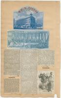 Vignette view clipped from an advertisement showing the interior of the coach and carriage factory on the 800 block of North Sixth Street. Shows several smiths at work stations divided by brick partitions with forges lining the wall. The workers use anvils, hammers, and bellows. Also shows a foreman and well-dressed gentleman conversing in the corner, wagon wheels mounted on a wall, and carriage frames in different stages of completion on the floor.