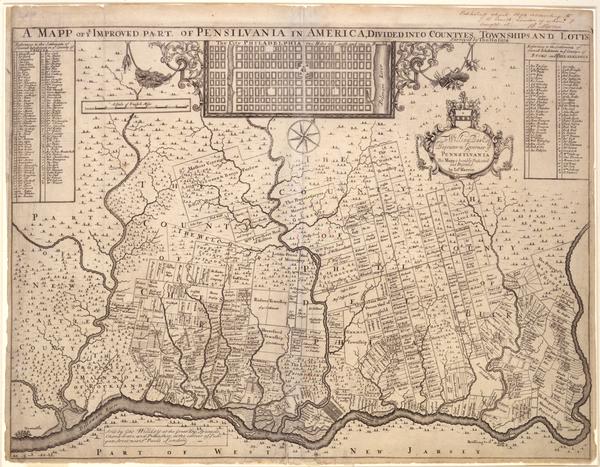 Dedicated to W. Penn, Esq. proprietor and governor by John Harris. With references to settlements and the names of owners, also with plan of Philadelphia (inset) "two miles in length and one in breadth."