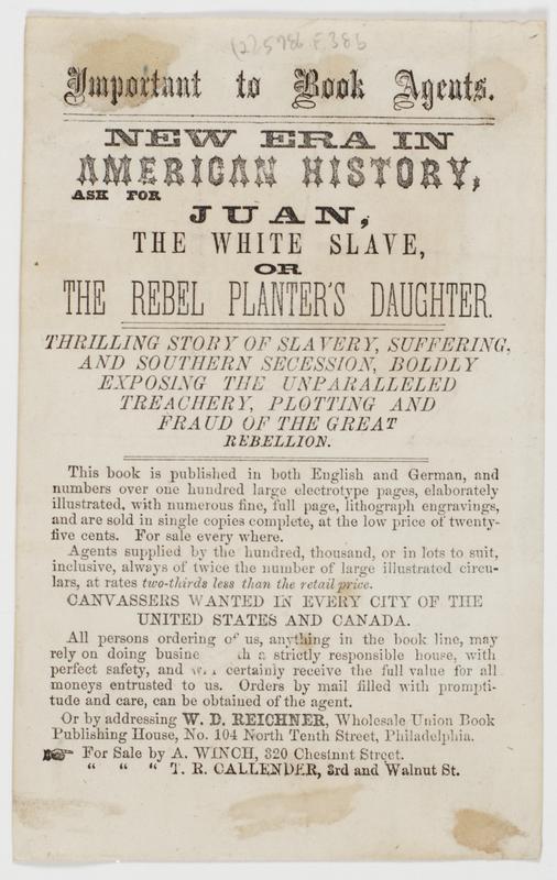 Important to book agents. : New era in American history, ask for Juan, the white slave, or The rebel planter's daughter. Thrilling story of slavery, suffering, and Southern secession, boldly exposing the unparalleled treachery, plotting and fraud of the Great Rebellion..