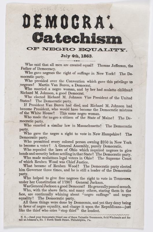 Broadside in question and answer form accusing the Democratic Party of favoring suffrage for African Americans.