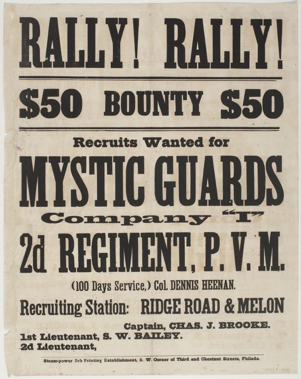 Rally! Rally! $50 bounty $50 recruits wanted for Mystic Guards Company "I" 2d Regiment, P.V.M. (100 days service) Col. Dennis Heenan ...