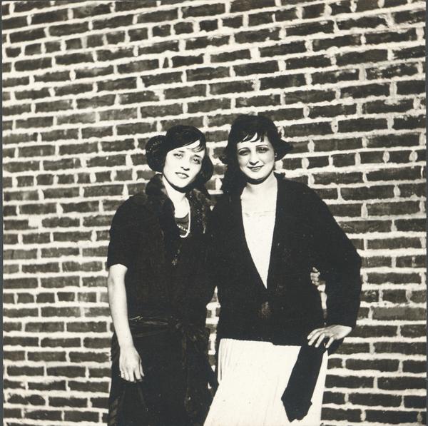 Depicts two women leaning against brick wall, with their arms around each other's waists facing camera.