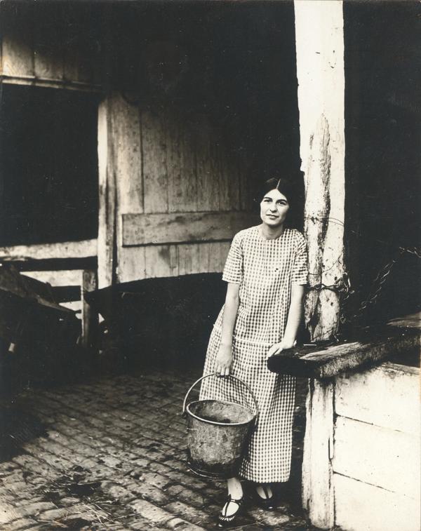 Depicts woman in patterned dress, white stockings, and black and white shoes leaning on beam of building (perhaps barn or stable), holding pail, looking at camera.