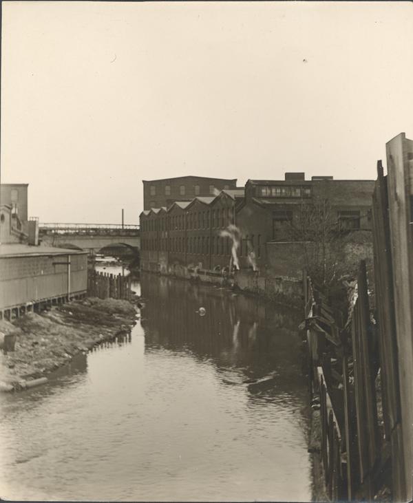Depicts bend in creek with industrial buildings lining banks and bridge crossing creek in the distance.