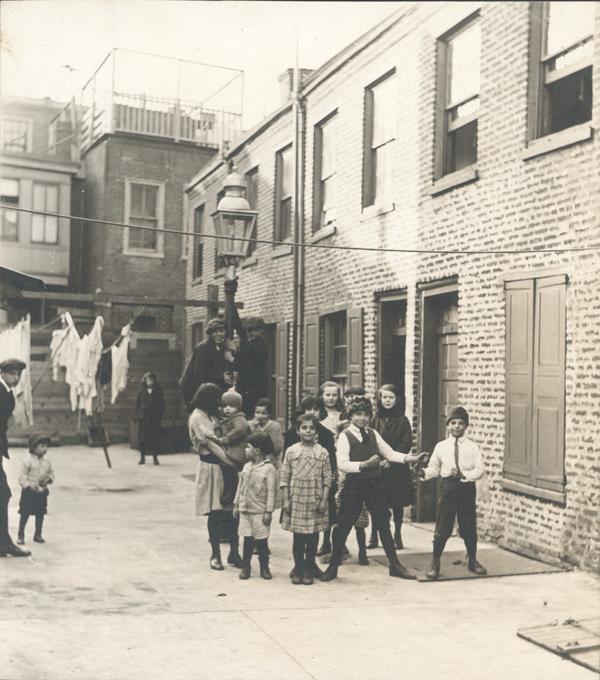 Depicts fifteen children in the courtyard between their row homes. Two boys in the background have climbed a lampost to pose for the picture. Two other boys are posed with their fists clenched in a boxer's stance. One older girl holds a younger child and faces away from the camera. Still other children pose proudly. Wash hangs in the courtyard.