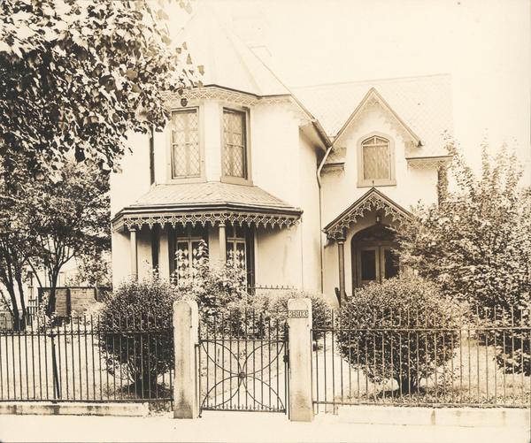 Exterior view showing one of two speculative houses commissioned in 1851 by Philadelphia developer Samuel Aden Harrison. Built after the designs of Philadelphia architect Samuel Sloan, the gothic-style house with bay windows was to be a model for a proposed upper class residential suburb in West Philadelphia.