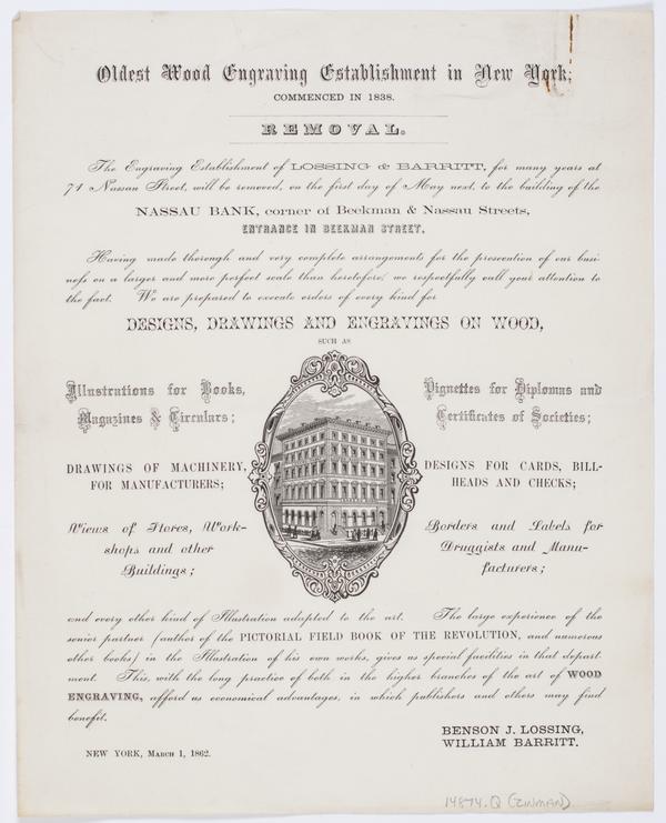 Oldest wood engraving establishment in New York. Commenced in 1838. Removal. : The engraving establishment of Lossing & Barritt, for many years at 71 Nassau Street, will be removed, on the first day of May next, to the building of the Nassau Bank, corner of Beekman & Nassau Streets, entrance in Beekman Street. ... / Benson J. Lossing, William Barritt. New York, March 1, 1862.