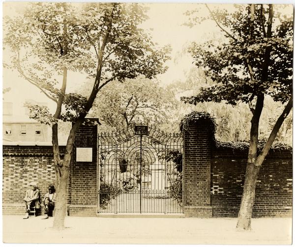 View showing the front gate, adorned with a stone marker, of the Jewish Philadelphia cemetery Mikveh Israel. A brick wall surrounds the entrance with a wrought iron gate, which leads to a path through the cemetery. In the left, two men, including an African American, sit with their legs crossed on crates near the gate. Trees flank the gate, and more trees are visible beyond on the grounds. Established as a private burial ground in 1738 by Jewish businessman Nathan Levy, the cemetery was deeded to the Mikveh Israel congregation in 1774.