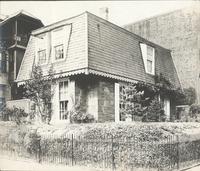 Shows a cottage-style residence with a truncated roof and fenced lawn in West Philadelphia. House surrounded by small trees, shrubbery, and an ivy-covered lawn.