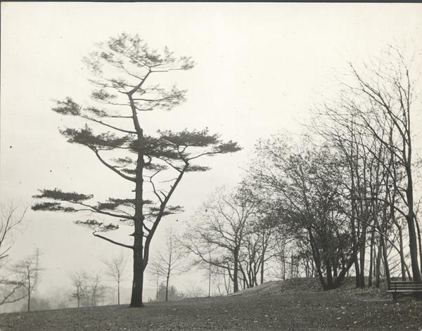 View of tall tree standing apart from other leafless trees near a bench. Bartram's Garden, the first botanic garden in the country cultivated by botanist and farmer John Bartram in the mid 18th century, was restored by the John Bartram Association in the 1920s after many years of neglect.