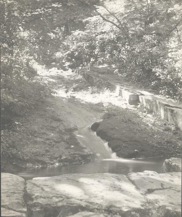 Photographer's manuscript note on verso: The wee tributary seem [sic] to spring from nowhere and plung [sic] into the main stream without fuss or confusion. O, that we could enter and flow along with the stream of life with the quietude and complacency of this wee brook. Why the battle? Why the strife? Why the doubt? Why the fear? Irving wrote (in his "The Brook") "while I go on forever" so it is with life, not what we matearialistic [sic] call life. Ah! No. The spirit, that inner life. The infinite, that all enveloping [sic] life - forever, onward, into the glow of understanding, achieving, persuing [sic], enjoying, loving. In a word forever. A soul comes into being, a soul will forever be.
