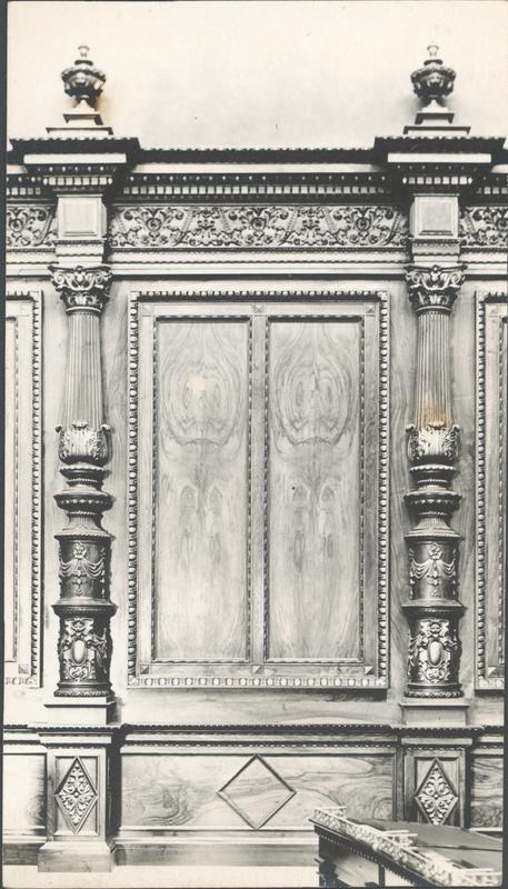 Photographer's manuscript note on verso: Panel of Circassian Walnut in Finance room, City Hall. There are 32 such panels in this room. Note: two grotesque heads like jack o'lantern faces. Two women in flowing robes under each head. Bay and landscape in bottom panel. All of these things are in the grain of the wood. Note master workmanship of carving. This is not putty moulding.