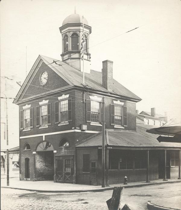 View of of the "Headhouse" of market from north side of Pine Street. The fire-engine house (i.e., headhouse), designed with a cupola and alarm bell, was added around 1804 with the extension of the market sheds to South Street. The market was razed in 1956 and rebuilt between 1959 and 1963.