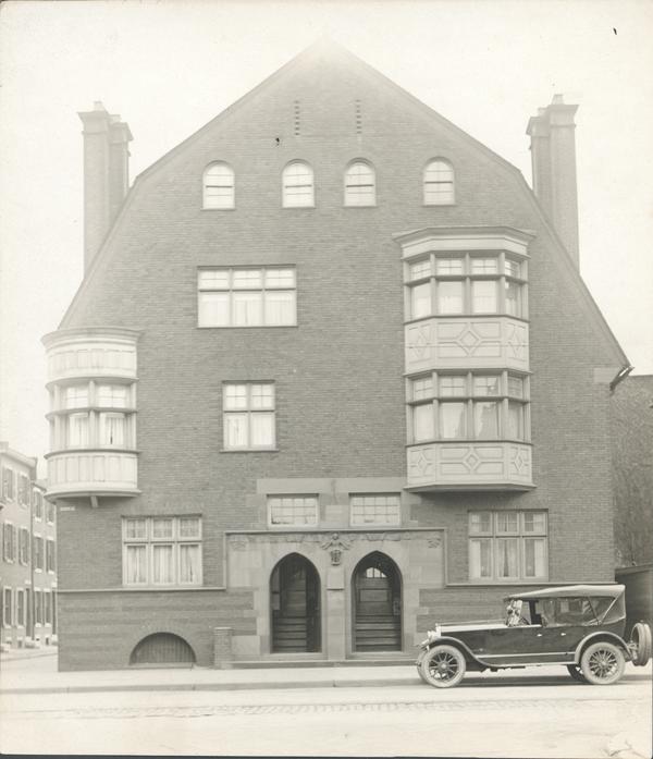 View of front facade of brick duplex with automobile parked in front. Roofline of building resembles that of a barn; two sets of bay windows, one circular and one polygonal, project from facade.