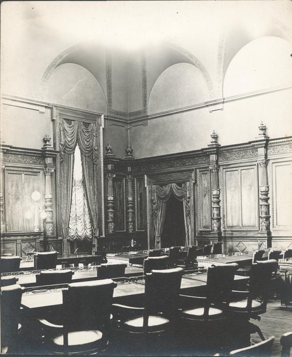 Depicts Finance Committee Room (i.e. City Council Administration, Room # 496) filled with desks and chairs; ornate wood paneling lines walls. Designed by architect John McArthur, Jr., City Hall was built 1871-1901.