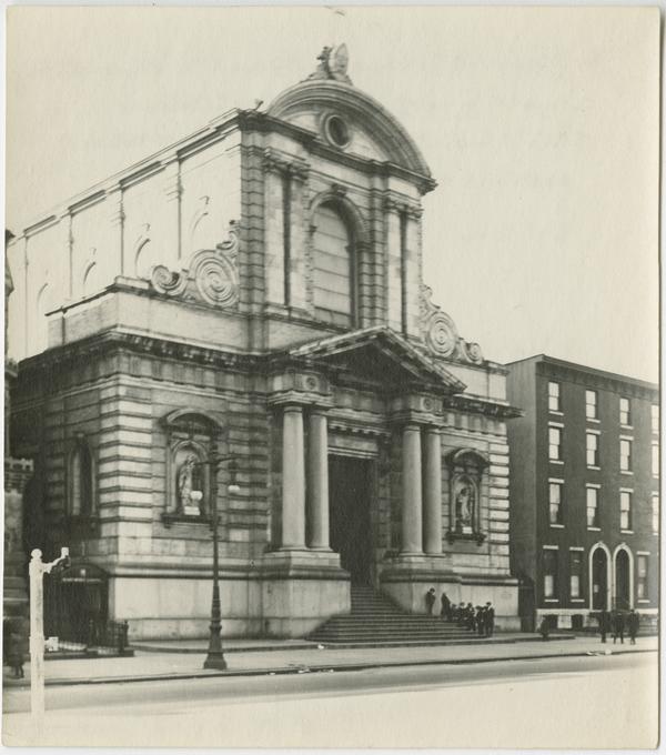 Depicts exterior facade of St. Rita's of Cascia Roman Catholic Church at 1154-1162 S. Broad Street taken from east side of Broad St. with two groups of people gathered on the front steps and sidewalk. Includes dramatic columned entrance. Designed by architect George Ignatius Lovatt, Sr., building was built c. 1907.