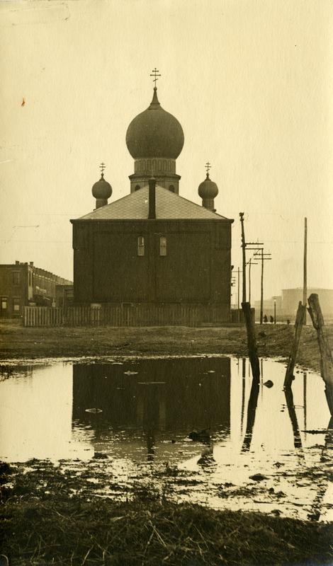 Depicts the rear of a church with cupolas and spires, probably the Assumption of the Holy Virgin Russian Orthodox Greek Catholic Church, later Assumption of the Holy Virgin Russian Orthodox Church at 2101 S 28th Street (28th and Snyder Sts.). Church reflects into a large puddle in foreground of picture. Holy Virgin parish was formed by mainly Carpatho-Russian members of the community in 1913. In 1973 "rib type" cupolas replaced the copper cupolas.