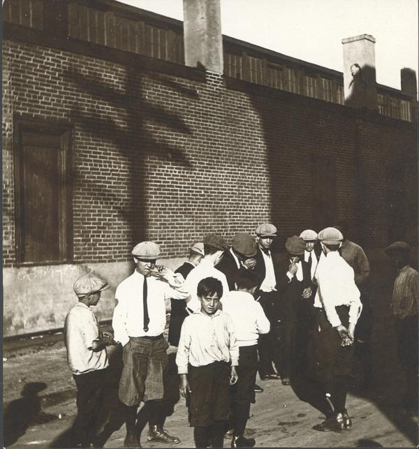 [Young men in front of shadowed brick wall, unidentified location] [graphic].
