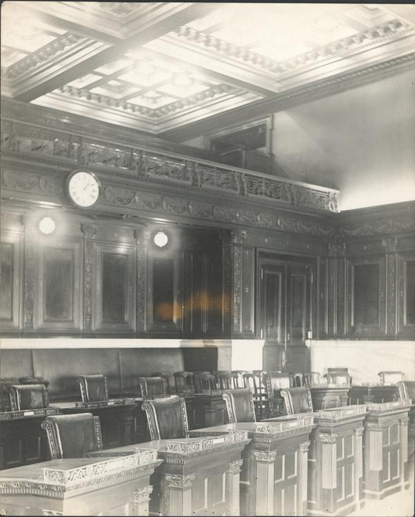 Depicts Select City Council Chamber (i.e. Office of Chief Clerk, Room # 402) including rows of ornate desks and elaborate wood paneling lining walls. Designed by architect John McArthur, Jr., City Hall was built 1871-1901.