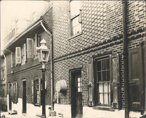 Photographer's manuscript note on verso: McKinley's Court - 2" St ab ______ [Noble] St. This is undoubtly [sic] the most picturesque court in Phila. Note old Flemish bond brickwork. The old community hydrant is there. The old community entrance - to say nothing of the new community lamp post. Cheese bag hanging on window frame of 2" floor window.