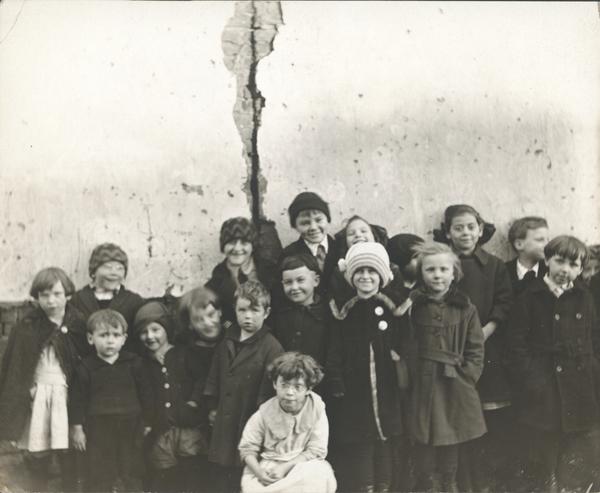 Photographer's manuscript note on verso: A group from one of the melting pot sections of Phila., Southwark. Note: the two little boys on the left, the questioning seriousness of one and the amused assurance of the other. (Tell about sledding down an ash pile without snow, ice or cold weather and about tin-can-decorated trees and electric wires.)