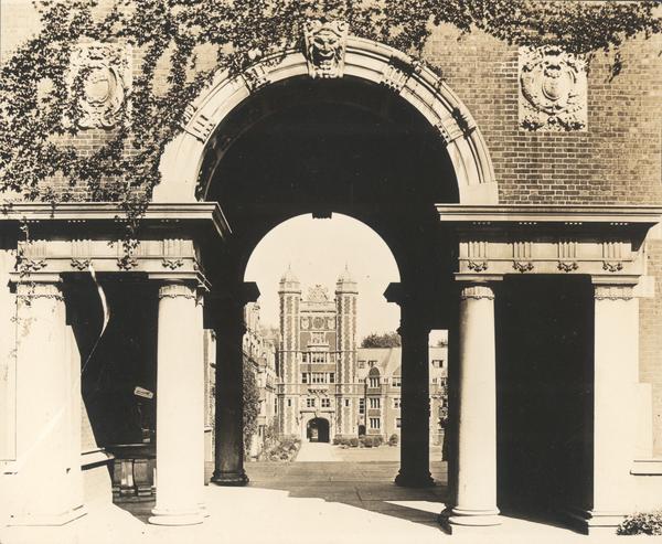 View through arch of University of Pennsylvania dormitories known as The Quad, or Quadrangle Dormitories. Arch is adorned with ivy, columns, and various decorative architectural elements. In the distance, Provost's Tower is visible. Architectural firm Cope and Stewardson designed the Quad, which was built from 1894 - 1911. It is located between S. 36th St., S. 38th St., Spruce St., and Woodland Ave. That part of Woodland Ave. is now called Hamilton Walk.