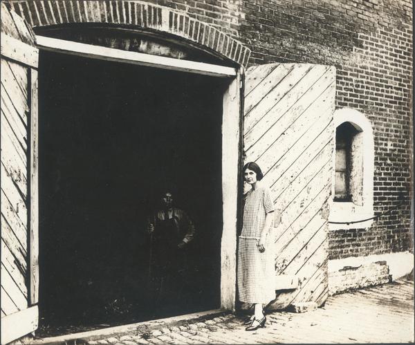 Woman in loose, patterned dress and black and white low-heeled shoes stands outside large open doors of brick building (possibly a barn or stable), looking at camera. Man stands within the shadows inside doorway also looking at camera, wearing an apron, tie, and shirt, and holding a tool that reaches to the ground.