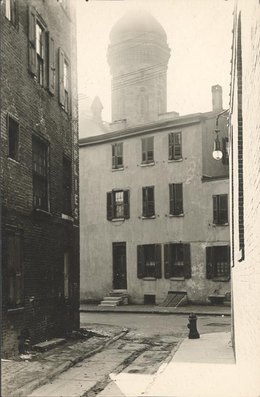 Depicts alley surrounded by buildings with tower of synagogue at Broad and Green Streets in background. Synagogue was designed by architectural firm Fraser, Furness & Hewitt, built 1869, and demolished 1925.
