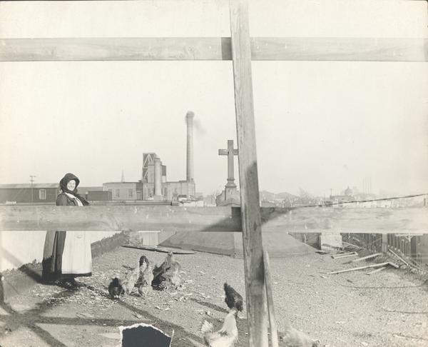 Depicts woman standing on roof of building near 10th and Ellsworth Streets, Philadelphia, smiling at camera with chickens at her feet. In the background a cross, presumably atop a church, and smokestack are visible.