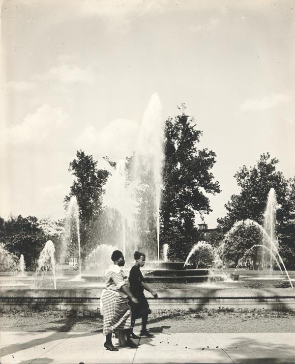 Scene depicting two African American women walking past the Swann Memorial Fountain at Logan Square in Philadelphia before the installation of Alexander Stirling Calder's sculpted naiad figures in 1924. In the foreground, two women walk side-by-side on the sidewalk in front of the active fountain. Walking on the inside, the woman is attired in a black dress, stockings, and shoes, and the woman walking on the outside closer to the viewer is attired in a patterned dress, black stockings, and shoes.