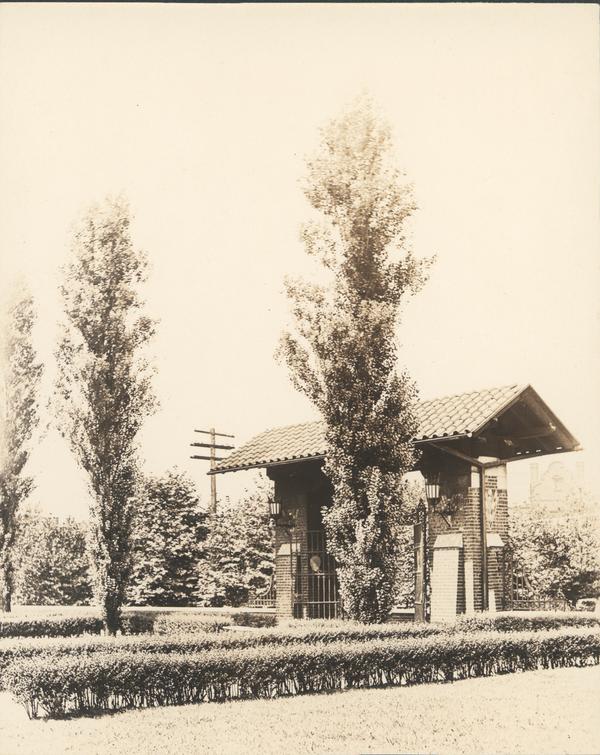 Depicts gateway surrounded by trees and shrubs. Architect Wilson Eyre, Jr. headed the team of architects who designed the University Museum buildings and surrounding gardens. Construction of the original buildings began in 1899 and ended in 1929.