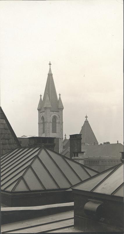 Photographer's manuscript note on verso: Lutheran Church spire. Van Pelt and Chestnut Sts. Taken from roof on 22 St. no of Walnut. (Try another of this spire - from street).