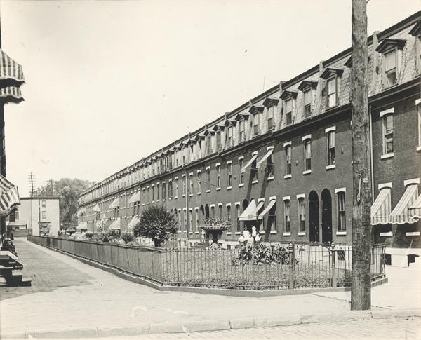 View of identical row houses with a garden along the street in front of the houses. Five people stand near one house.