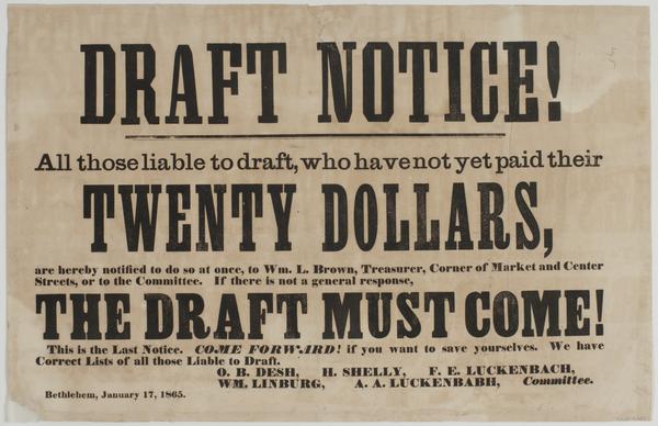 Draft notice! : All those liable to draft, who have not yet paid their twenty dollars, are hereby notified to do so at once, to Wm. L. Brown, treasurer, corner of Market and Center Streets, or to the committee. If there is not a general response, the draft must come! This is the last notice. Come forward! if you want to save yourselves. We have correct lists of all those liable to draft. / O.B. Desh, H. Shelly, F.E. Luckenbach, Wm. Linburg, A.A. Luckenbabh [sic], committee. Bethlehem, January 17, 1865.