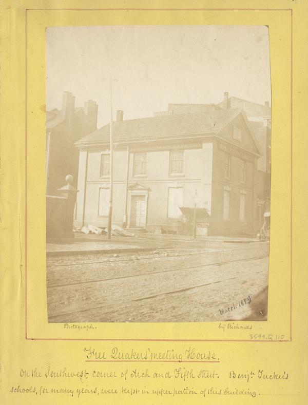 Shows the former meeting house built 1783 after the designs of Free Quakers Timothy Matlack and Samuel Price Wetherill at
