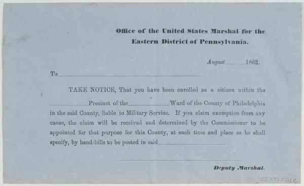 Office of the United States Marshal for the Eastern District of Pennsylvania. August [blank] 1862. : To [blank] Take notice, that you have been enrolled as a citizen within the [blank] precinct of the [blank] Ward of the county of Philadelphia in the said county, liable to military service. If you claim exemption from any cause, the claim will be received and determined by the commissioner to be appointed for that purpose for this county, at such time and place as he shall specify, by hand-bills to be posted in [blank] [blank] deputy marshal.