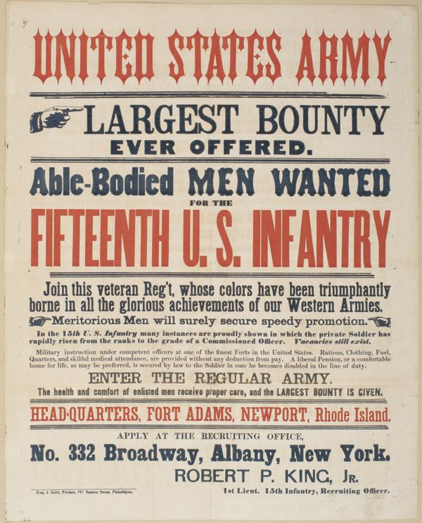 United States Army Largest bounty ever offered. : Able-bodied men wanted for the Fifteenth U.S. Infantry Join this veteran reg't, whose colors have been triumphantly borne in all the glorious achievements of our western armies. Meritorious men will surely secure speedy promotions. ... Enter the regular army. The health and comfort of enlisted men receive proper care, and the largest bounty is given. Head-quarters, Fort Adams, Newport, Rhode Island. Apply at the recruiting office, No. 332 Broadway, Albany, N.Y. Robert P. King, Jr. 1st Lieut. 15th Infantry, recruiting officer.