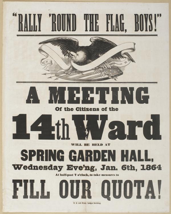 "Rally 'round the flag, boys!" : A meeting of the citizens of the 14th Ward will be held at Spring Garden Hall, Wednesday eve'ng, Jan. 6th, 1864 at half-past 7 o'clock, to take measures to fill our quota!